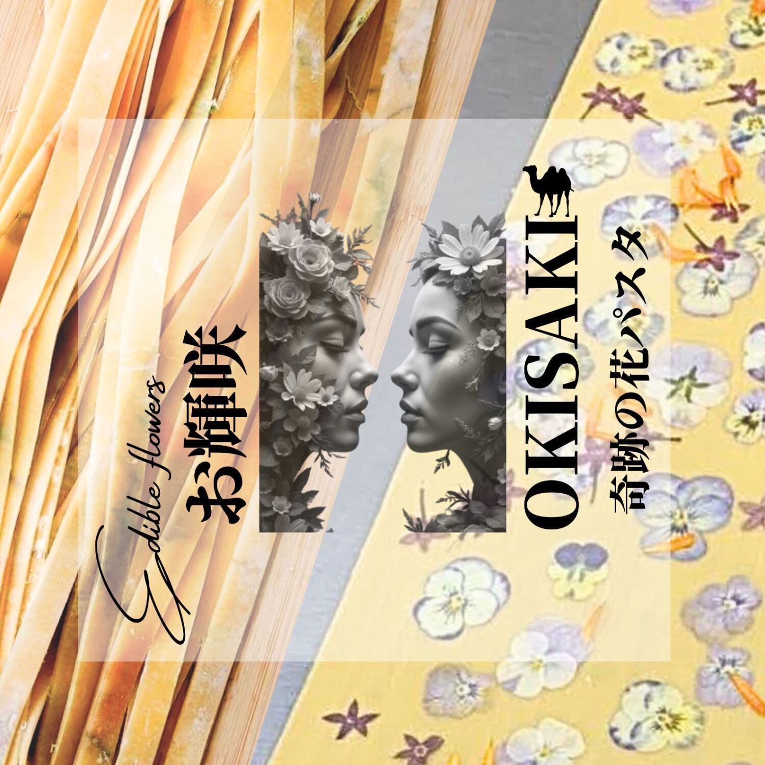 鳥取県オリジナルの食用花の麺の商品化。押し花を麺と麺の間に挟んでいます。